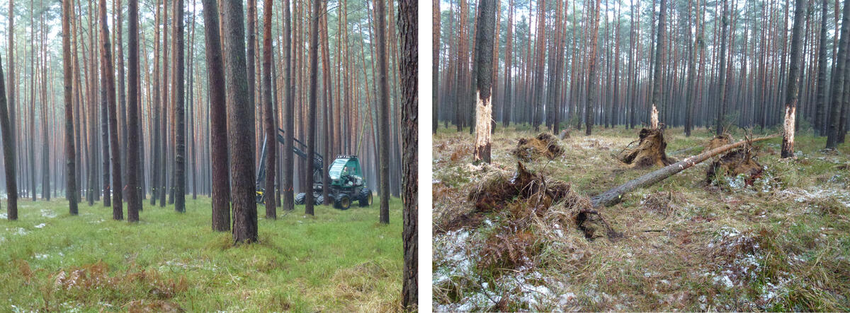 Auf jeder Untersuchungsfläche der Varianten 1–3 wurden 30 Lücken (jeweils zehn à 100, 250, 500 m²) mithilfe eines Harvesters geschaffen. Die Lücken wurden zufällig auf den Untersuchungsflächen verteilt.